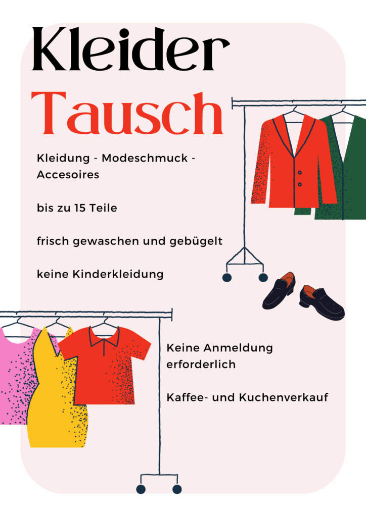 Lieblingsstücke verdienen ein zweites Leben! Beim Café Kleidertausch laden wir dich ein, in entspannter und gemütlicher Atmosphäre Kleidung, Modeschmuck und Accessoires zu tauschen – ganz ohne Geld, dafür mit viel Freude am Entdecken.